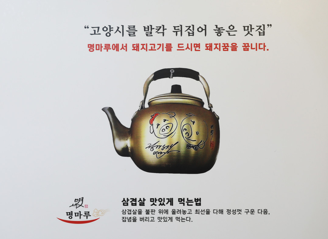 명마루는 개그맨이 운영하는 식당이니만큼 유쾌함을 많이 주는 식당이었다. ‘고양시를 발칵 뒤집어 놓은 맛집’이라는 식당 입구의 ‘자뻑’ 문구와 함께, 익살 넘치는 글귀와 소품이 가게 곳곳에 즐비하다. 식당에 들어서면 세계 생고기 조직위원장 Mr.막드슈가 수여한 표창장이 보인다.