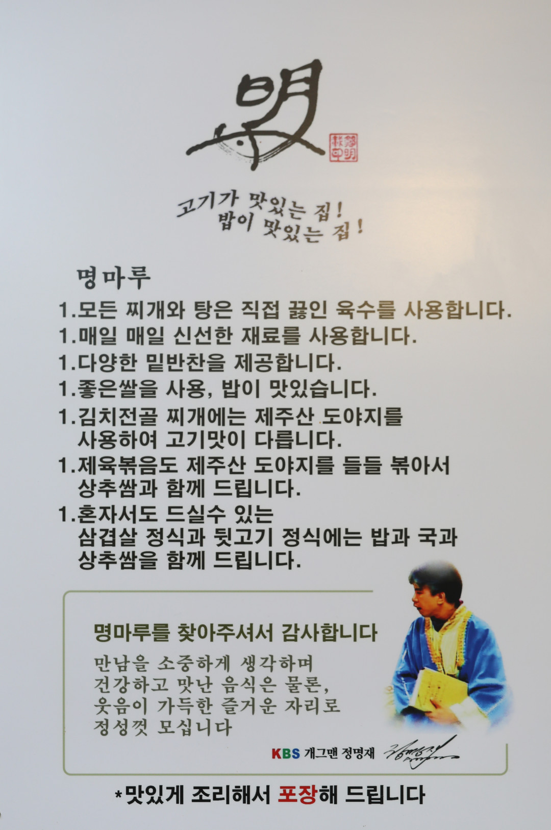 “명마루 정명재. 위 사람은 평소 투철한 책임감과 건전한 사업정신으로 타의 모범이 되었음은 물론 마약밀매, 하우스방, 또는 불법 성인 사이트 등을 운영하면 떼돈을 벌 수 있다는 숱한 유혹을 뿌리치고 오직 인류의 건강증진을 위하여 음식점을 선택하였을 뿐만 아니라, 정성을 담긴 식사와 질 좋은 고기를 사용함으로써....”