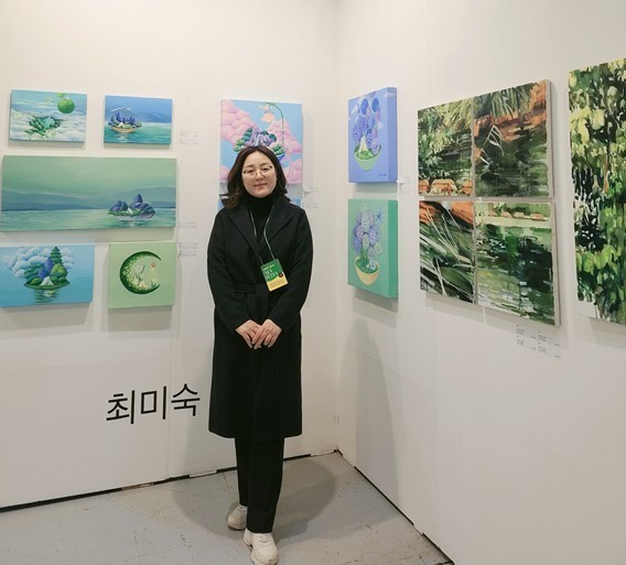 최미숙 작가는 안식처를 의미하는 스페인어 '퀘렌시아(querencia)'를 주제로 재구성된 기억의 유토피아를 그린다. 파스텔 계열의 색채로 몽환적이고 동화적인 세계를 표현하는 그의 작품은 현실과 가상의 경계에 위치한다. 작가는 "유목적 삶의 고단함 속에 온전한 나를 위한 안식처"를 캔버스에 담아내며, 기억의 파편들로 구성된 주관적 풍경을 통해 시공간의 경계 없는 세계를 펼쳐 보인다.