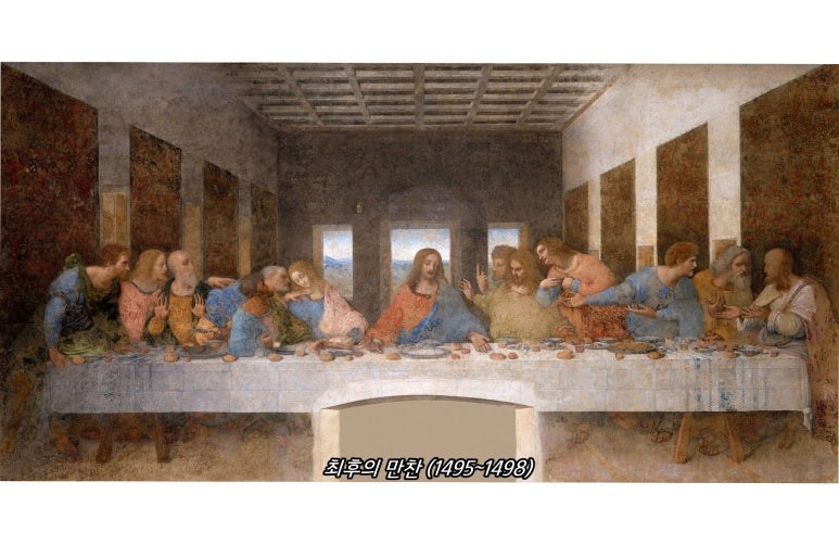 최후의 만찬 (The Last Supper, 1495~1498): 밀라노 산타 마리아 델레 그라치에 성당에 그려진 이 벽화는 원근법과 인물들의 심리 묘사의 정점으로 불린다.
