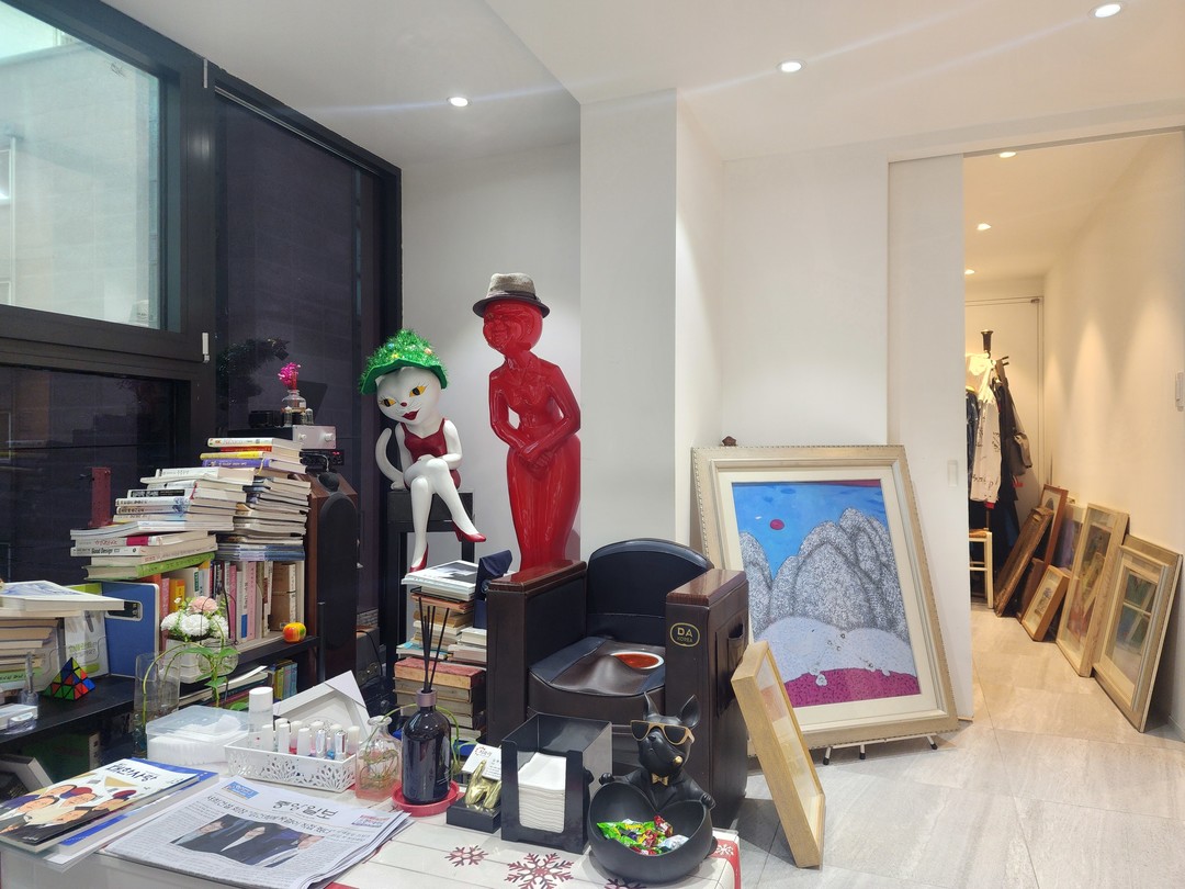 1층에서는 20세기 초 일본에서 실제로 사용하던 주크박스를 비롯해 문훈숙 유니버설발레단 단장의 초창기 발레 사진 작품 등 다양한 전시물과 만날 수 있다. 이어 항아리, 고서적, 조각품 등이 놓인 계단을 통해 윗층으로 올라가면 더 많은 작품이 기다리고 있다. 꼭대기 층에서 만난 이우환, 이종학, 천경자의 그림은 특히 반가웠다. 그런데 몇 작품 빼고 대부분의 작품이 바닥에 그냥 두서없이 널려 있는 게 독특했다. 심지어 그 귀한 천경자의 ‘미인’도, 최영림의 ‘여인’도 바닥에 아무렇게나 놓여 있었다. 얼마나 수집품이 많으면 그럴까 싶었다. 그러나 수집품이 많다는 것 외에 김 원장이 작품을 이렇게 보관하는 데는 이유가 있었다.